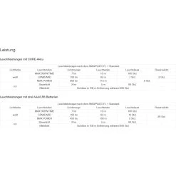 - trois niveaux d’éclairage blanc : MAX BURN TIME (autonomie maximale), STANDARD (meilleur équilibre puissance/autonomie) et MAX POWER (puissance maximale),