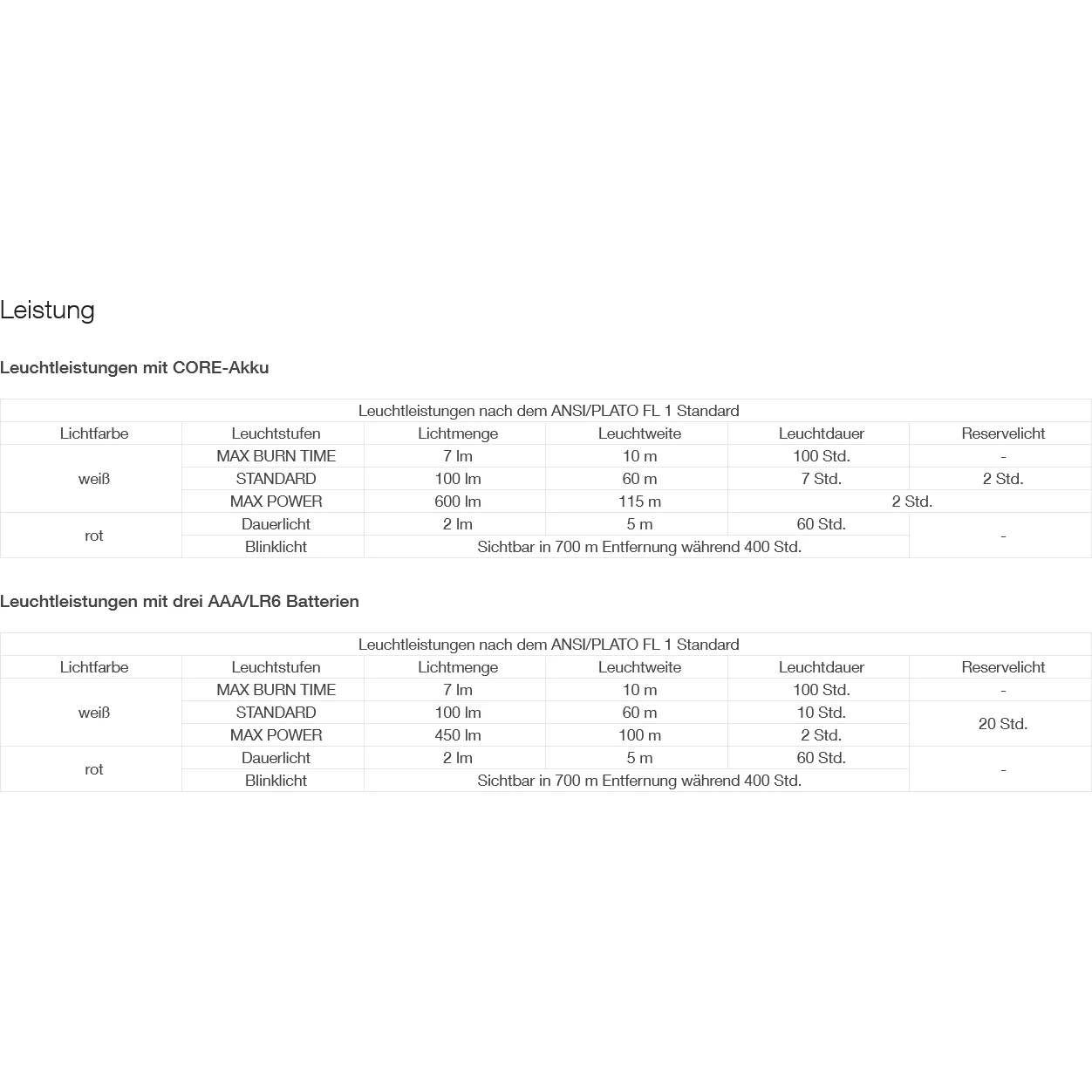 - construction HYBRID CONCEPT : livrĂ©e avec la batterie rechargeable CORE, ACTIK® CORE est aussi compatible avec trois piles AAA/LR03 (non fournies). La lampe dĂ©tecte automatiquement la source d’Ă©nergie et ajuste les performances d’Ă©clairage,
