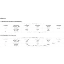 - trois niveaux d’éclairage blanc : MAX BURN TIME (autonomie maximale), STANDARD (meilleur équilibre puissance/autonomie) et MAX POWER (puissance maximale),