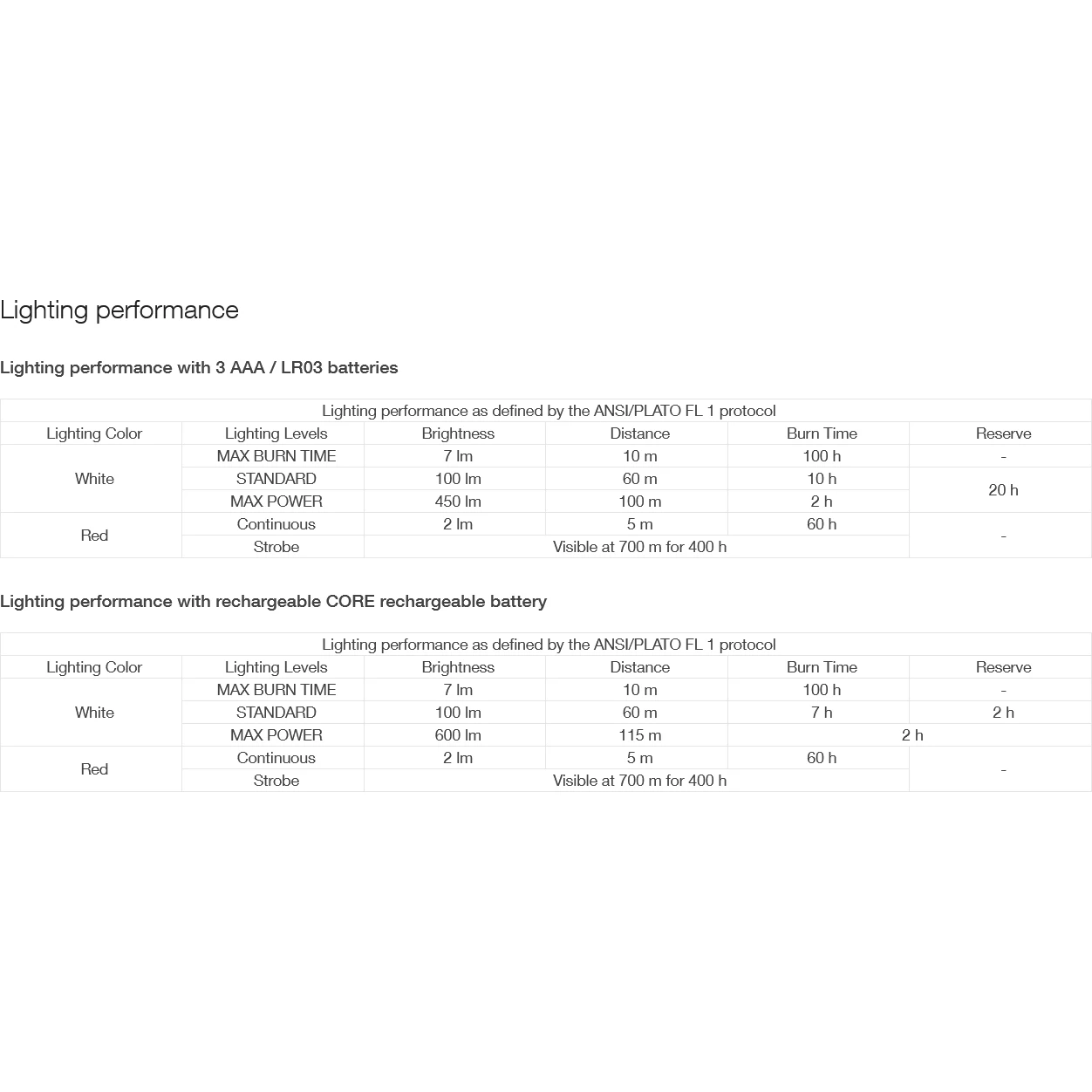 - construction HYBRID CONCEPT : livrĂ©e avec trois piles AAA/LR03, ACTIK® est aussi compatible avec la batterie rechargeable CORE (non fournie). La lampe dĂ©tecte automatiquement la source d’Ă©nergie et ajuste les performances d’Ă©clairage,