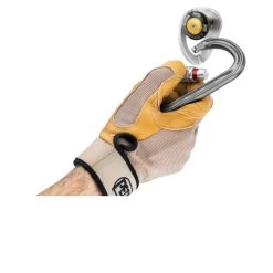 Le trou de connexion large et ergonomique facilite le clippage et peut accueillir deux mousquetons simultanément. L'épaisseur de matière élevée de la plaquette et ses bords arrondis limitent l'usure des connecteurs.